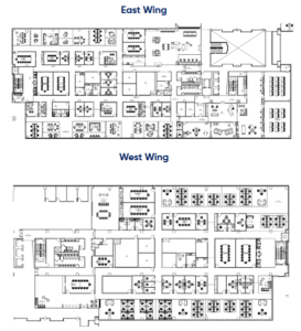 Conference Rooms: 22 total - 12 on East side, 10 on West side (small, medium, large) Private Offices: 13 total - 7 on East side, 6 on West side Training rooms: 2 (East side)