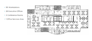 Sublease term through 9/30/2026; furniture negotiable; 99 workstations, 28 executive offices. 3 conference rooms and 1 office services area. Excellent on-site amenities include a campus cafe, conference center, fitness center and property management.
