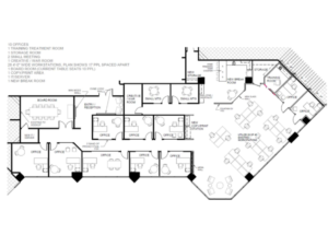 10 offices, training room, storage room, 1 board room (current table seats 10 ppl), 28Â workstations, new break room.